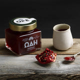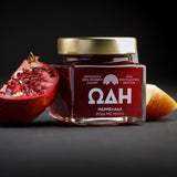 This homemade pomegranate marmalade is made of 100% fruit and fruit juices and nothing else. Prepared strictly without sugar, preservatives, colourants and glucose. It contains only fruits, and the slight sweet taste is due to the addition of natural grape juice. It's only preservative is some lemon juice, which gives it a delicious subtle citrus undertone. Its taste is simply superb!