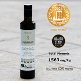 It is full of antioxidants and health beneficial properties, due to its high concentration of polyphenols, which is complying with E.E. health claim regulations for high phenolic olive oil. It has a very low acidity of around 0,1% with a beautiful intense green colour, rich, fruity and characteristically bitter and pungent flavour that balances harmoniously with the distinctive aroma of unripe Koroneiki olives.