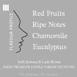 The organoleptic characteristics show a well-balanced olive oil with fruitiness (5.5), bitterness (5) and pungent (4.5). The flavours that emerge are tomato leaves, eucalyptus and a combination of herbaceous and fresh grass taste with a delicate peppery finish. It pairs exceptionally well with fish, meats, vegetables, bread and salads, and it's ideal for every day use too!